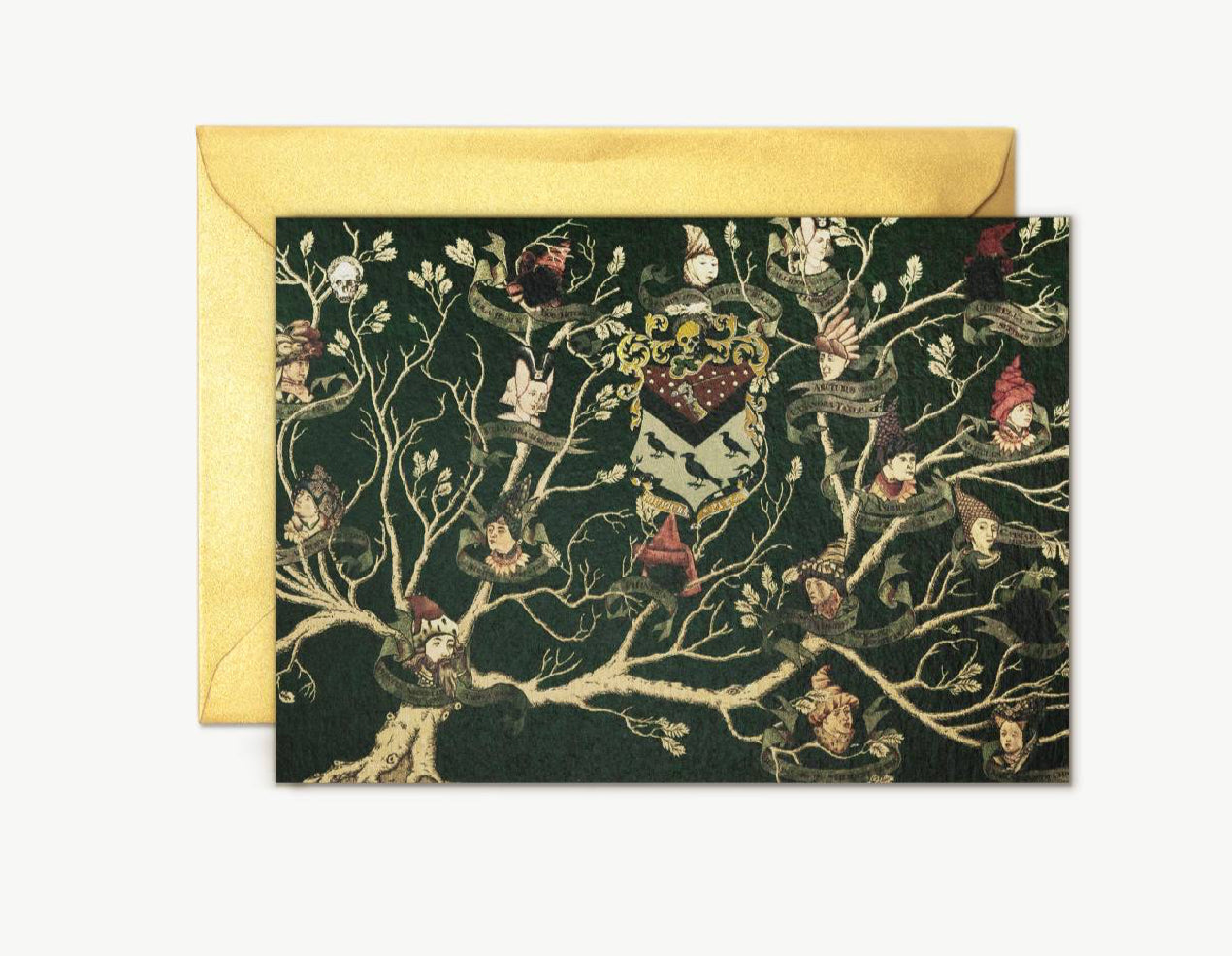 Invia un messaggio magico con la nostra notacard con l'arazzo Black Family. Con dettagli in lamina d'oro e uno spazio vuoto all'interno per il tuo messaggio, questa notacard è ispirata all'autentico oggetto grafico progettato da MinaLima per il film "Harry Potter e l'Ordine della Fenice".