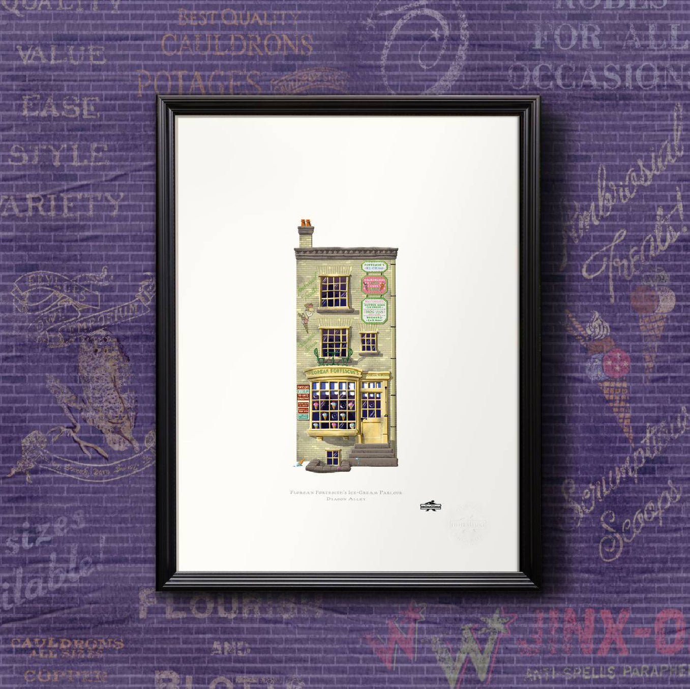 Fai un viaggio lungo Diagon Alley con la stampa artistica in edizione aperta con la facciata del negozio di Florean Fortescue's Ice-Cream Parlour, produttori di prelibatezze ambrosali e deliziose palline. Parte della serie illustrata Spellbinding Shops, questa stampa artistica celebra gli iconici disegni grafici creati da MinaLima per il negozio magico nella serie di film "Harry Potter".